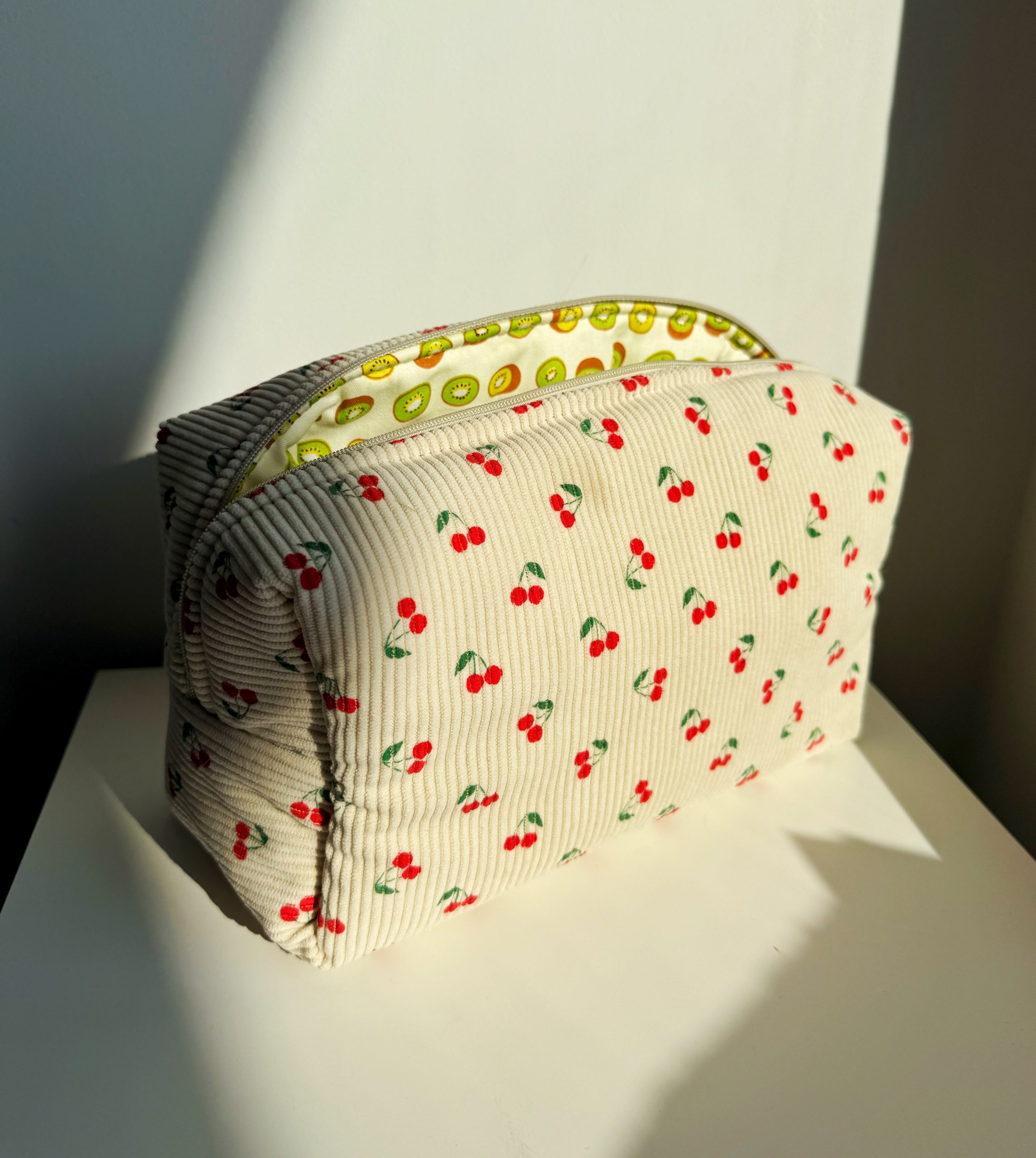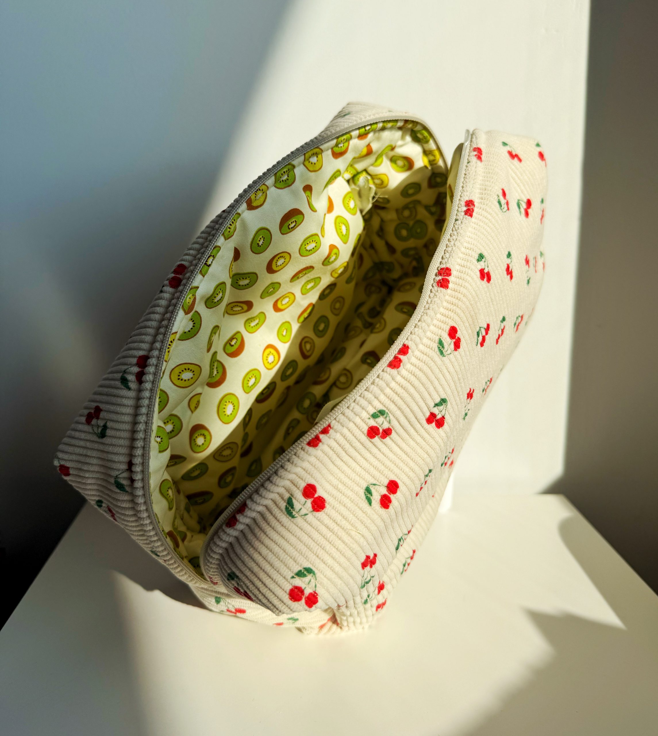 Zamek błyskawiczny umożliwia szybki dostęp do zawartości i zabezpiecza kosmetyki podczas transportu. Dzięki kompaktowemu rozmiarowi kosmetyczka w wisienki zmieści się w większej torbie, plecaku lub walizce, pomagając utrzymać porządek w każdej sytuacji – w pracy, na uczelni, na wakacjach czy w weekendowej podróży.